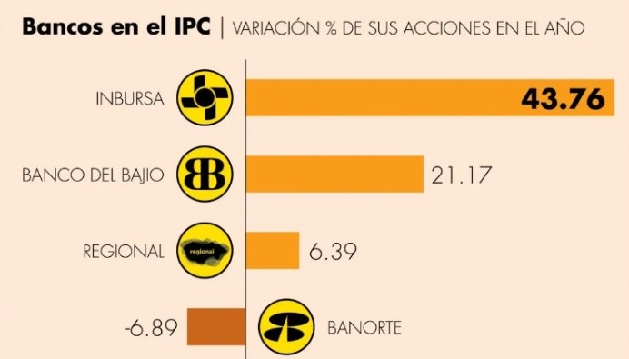 En contraste, Grupo Financiero Banorte es el único banco al interior del principal índice bursátil de México que pierde en el año, con una baja en sus papeles de 6.89 por ciento, a 123.86 pesos cada uno. Además, acumula una merma en valor de mercado de 26,412 millones de pesos.