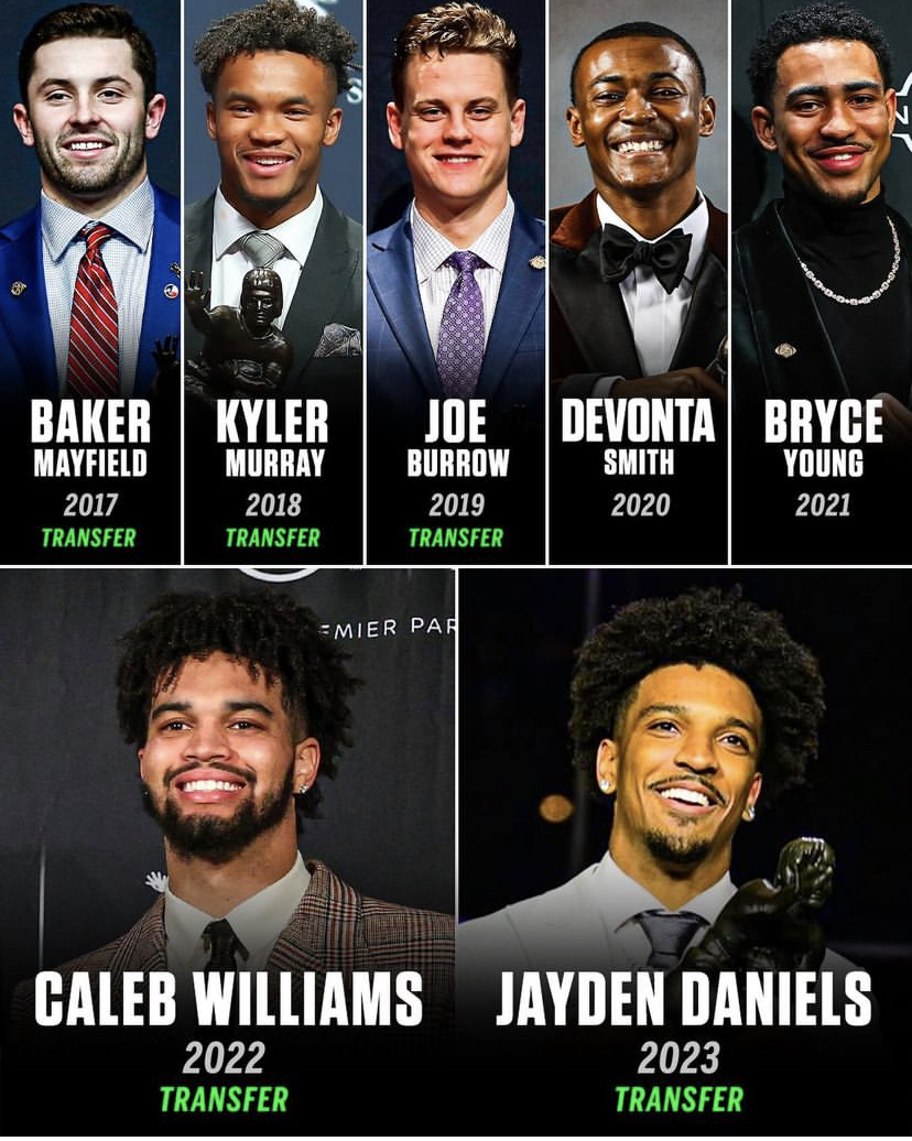 De los últimos siete ganadores del Heisman, cinco de estos fueron transferidos de sus Universidades iniciales.